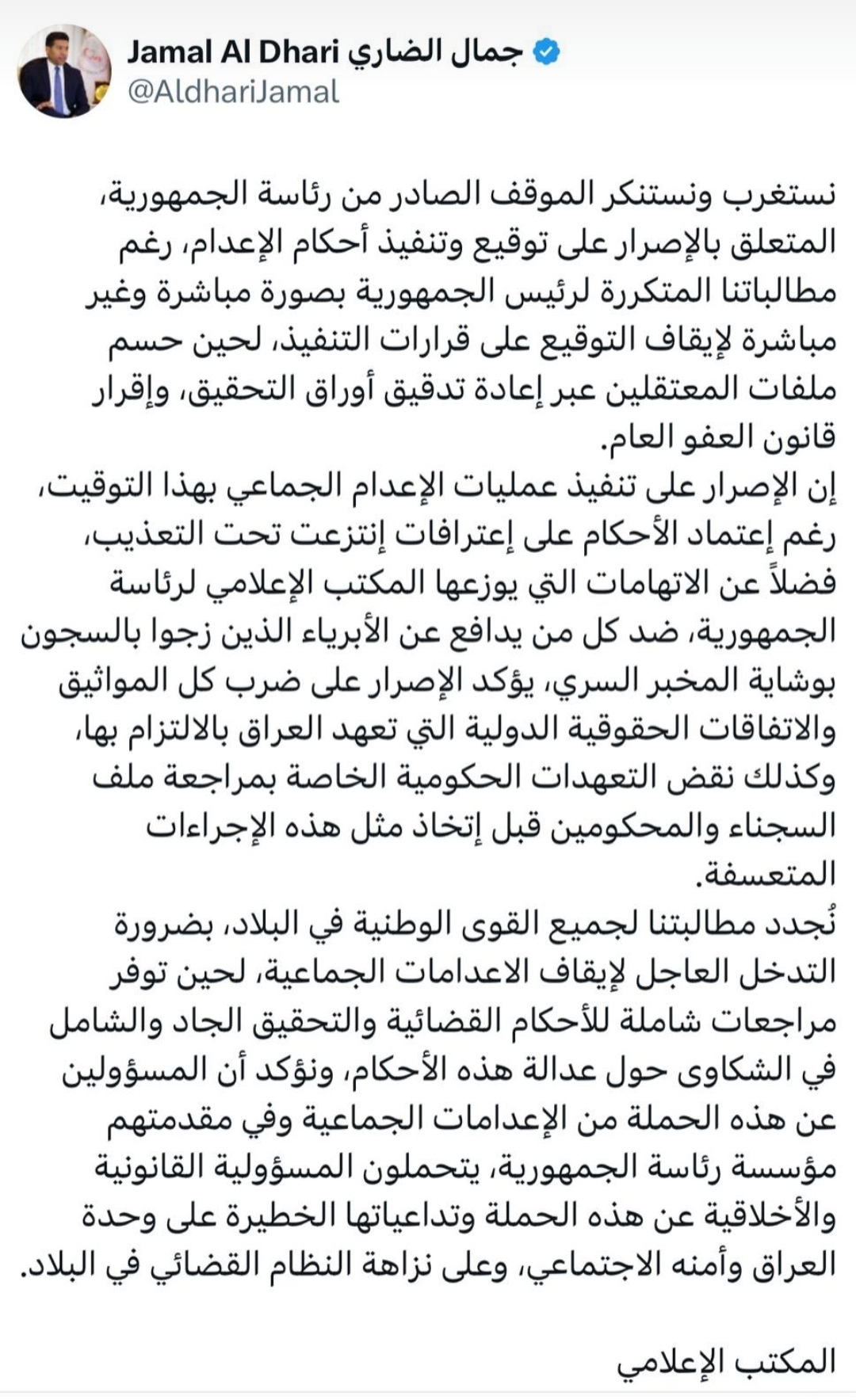 الضاري على منصة X: نستنكر اصرار رئيس الجمهورية على تنفيذ عمليات الاعدامات بطريقة مستعجلة