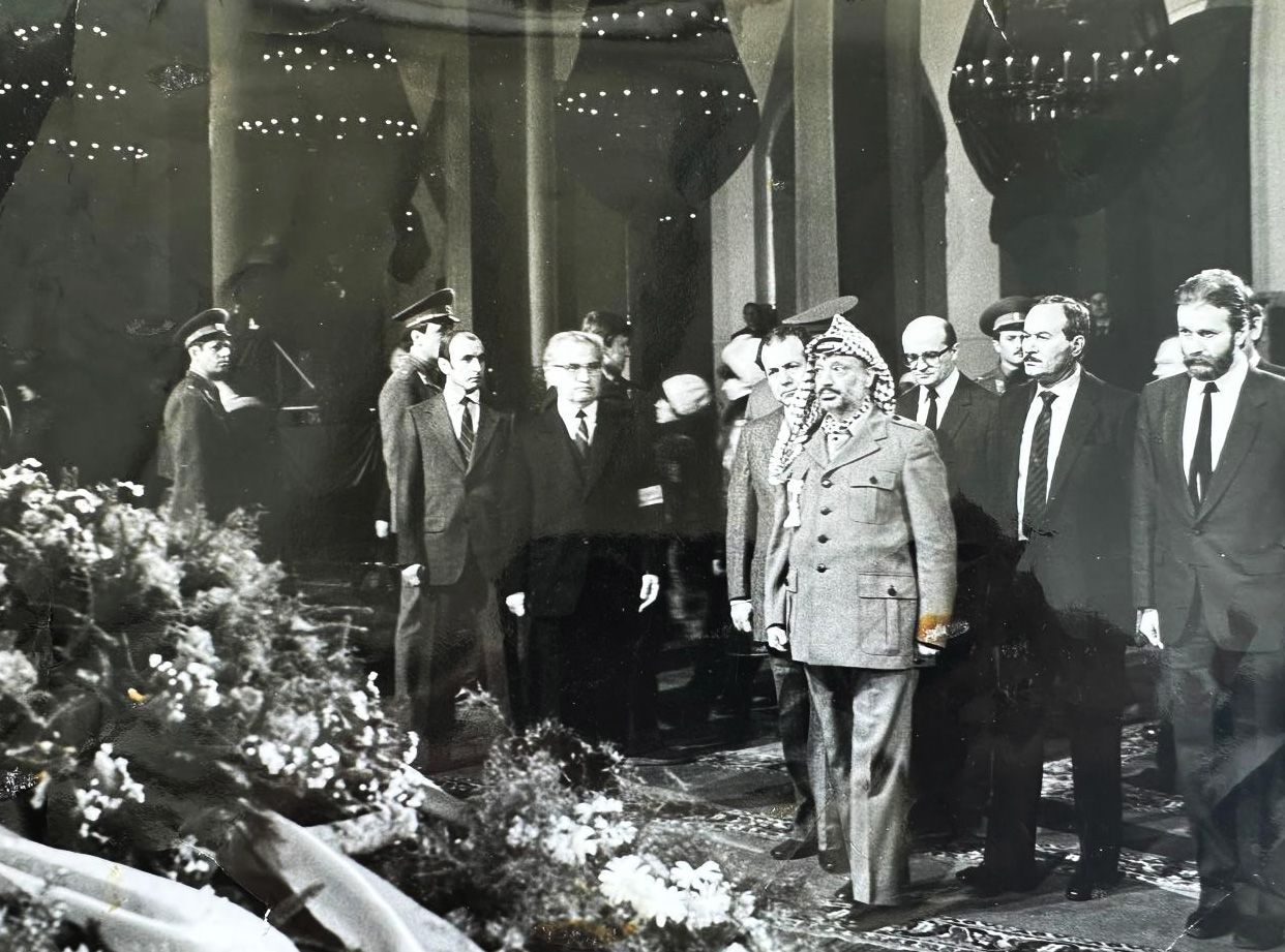وداع السيد يوري أندروبوف الأمين العام للحزب الشيوعي السوفييتي الذي خلف الراحل ليونيد بريجنيف، ويظهر “أبو اللطف” في الصورة وهو يقف خلف الرئيس “أبو عمار” ويظهر في أقصى يمين الصورة السيد رامي الشاعر عام 1984 في موسكو.