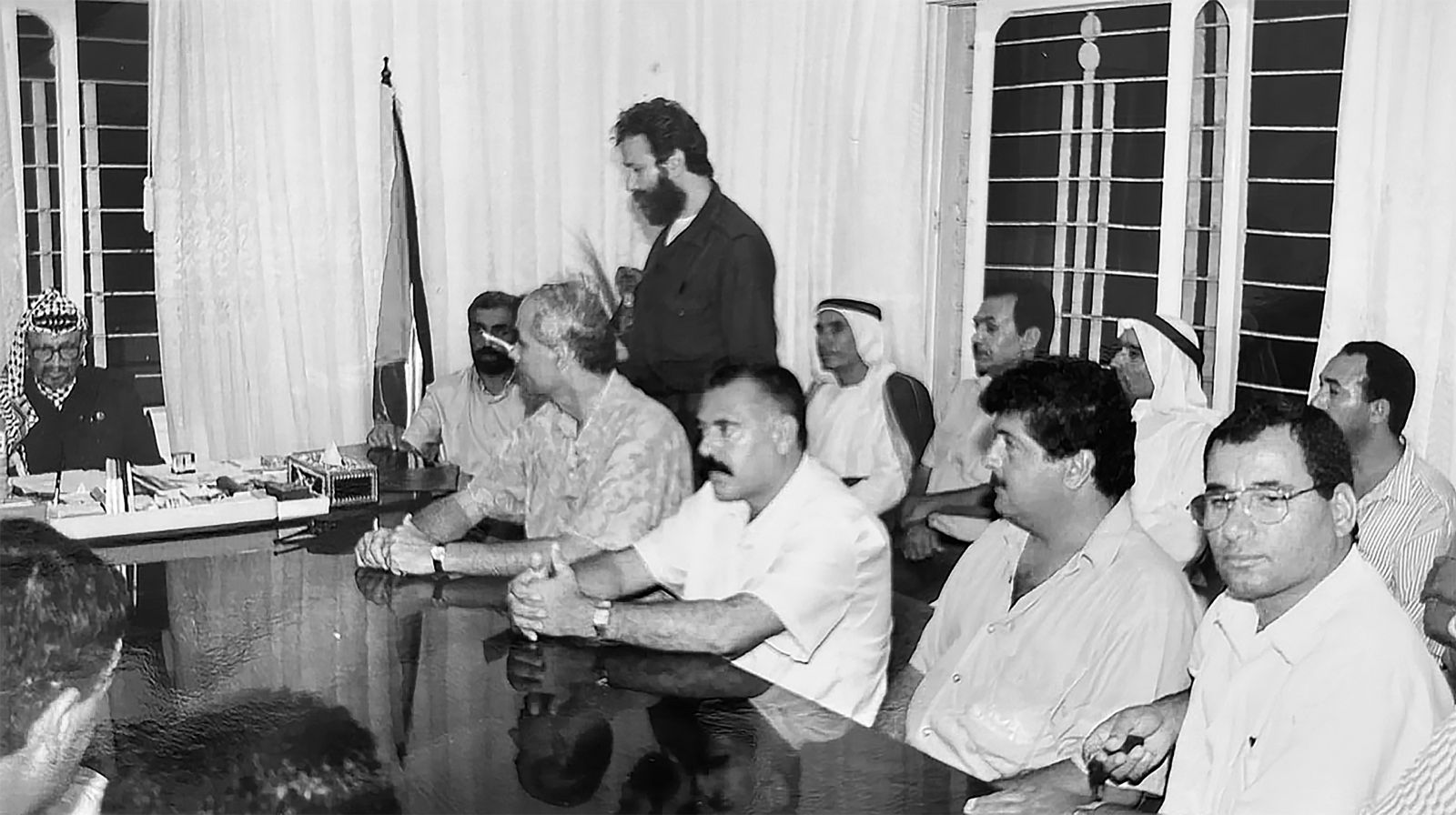 ويُذكر هنا أن الشهيد الرمز “أبو عمار” كان قد كلّف حينها السيد الشاعر بمهمة خاصة وحساسة، ويظهر في الصورة أدناه المستشار وهو يعرض النتائج بحضور مجموعة كبيرة من أبرز الشخصيات في قطاع غزة والضفة الغربية والذين ناقشهم السيد الشاعر بخصوص المهمة الموكلة له، وحينها وفي تقريره أبلغ الشاعر الرئيس ياسر عرفات: “إن اتفاق أوسلو هو فخ نُصب إلينا لتصفية القضية الفلسطينية وهو يهدف إلى تحويل قطاع غزة والضفة الغربية إلى معسكر اعتقال كبير، كسجن أنصار نديره نحن الفلسطينيين بأنفسنا وندفع تكاليفه بأنفسنا”.