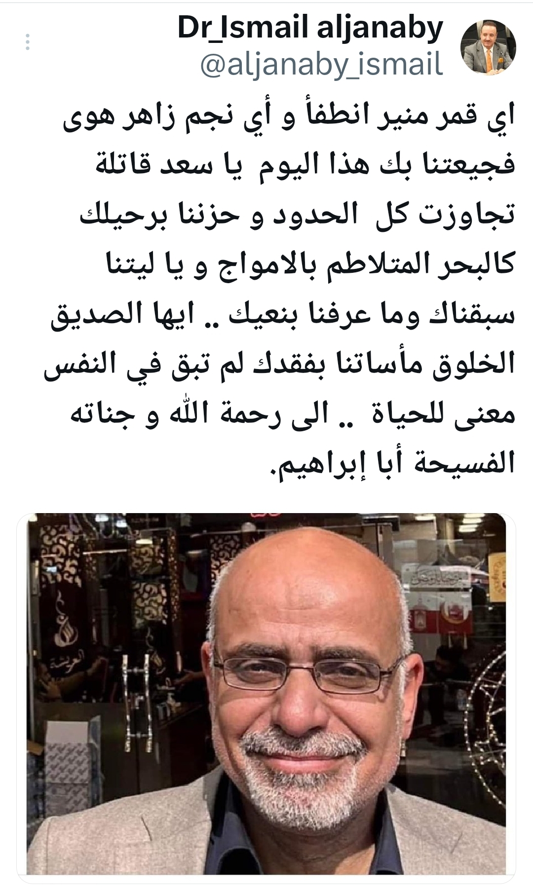 لقد المنا النبأ وفجعنا كما فجعتم ، فعند الله نحتسبه ، وإنا لله وإنا إليه راجعون … أحسن الله عزاءنا وعزاء اهل الفقيد ومحبيه وعظم أجورنا واجوركم جميعا ، وغفر الله لفقيدنا وتغمده الله برحمته ورضوانه … إن لله ما أخذ وله ما أعطى وكل شيء عنده بأجل مسمى ، وأن يلهم اهله ومحبيه الصبر والسلوان … ولا يخفى على الجميع ، أن الموت طريق مسلوك ومنهل مورود، وقد مات الرسل وهم أشرف الخلق عليهم الصلاة والسلام، فلو سلم أحد من الموت لسلموا، وصح عن النبي صلى الله عليه وسلم أنه قال: ((ما من عبد تصيبه مصيبة فيقول: إنا لله وإنا إليه راجعون ، اللهم أجرنا في مصيبتا واخلفنا خيراً منها )) وأن يعوضنا الصلاح والعاقبة الحميدة . لنصبر ولنتحتسب .سائلين المولى عز وجل ان يتغمد روح فقيدنا الغالي بواسع رحمتهِ ويلهم اهل الصبر والسلوان.