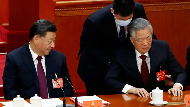 وكان من الواضح أن الرجل البالغ من العمر 79 عامًا وتولى قيادة الصين من 2003 إلى 2013 خضع لضغوط موظفين للنهوض من مقعده بجوار شي جينبينغ، وتتم مرافقته إلى الخارج رغما عنه كما كان واضحا.