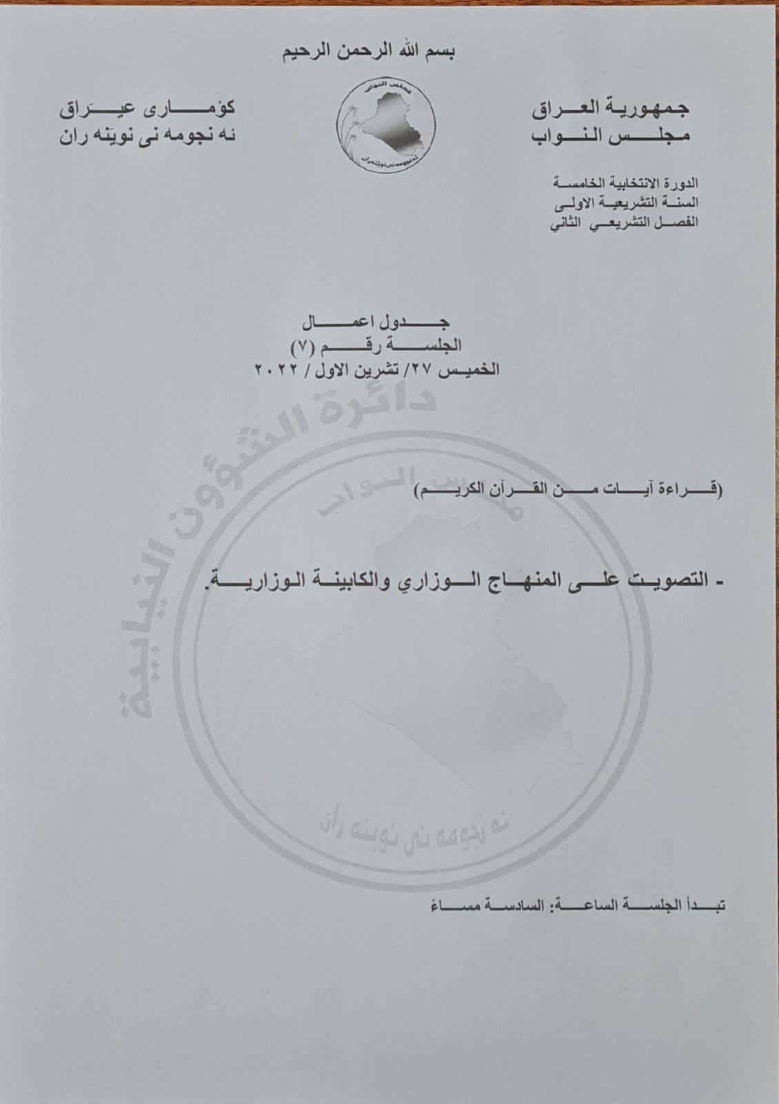 وذكر بيان للدائرة، أن “جدول اعمال مجلس النواب المقرر عقدها اليوم، التصويت على المنهاج الوزاري والكابينة الوزارية”.