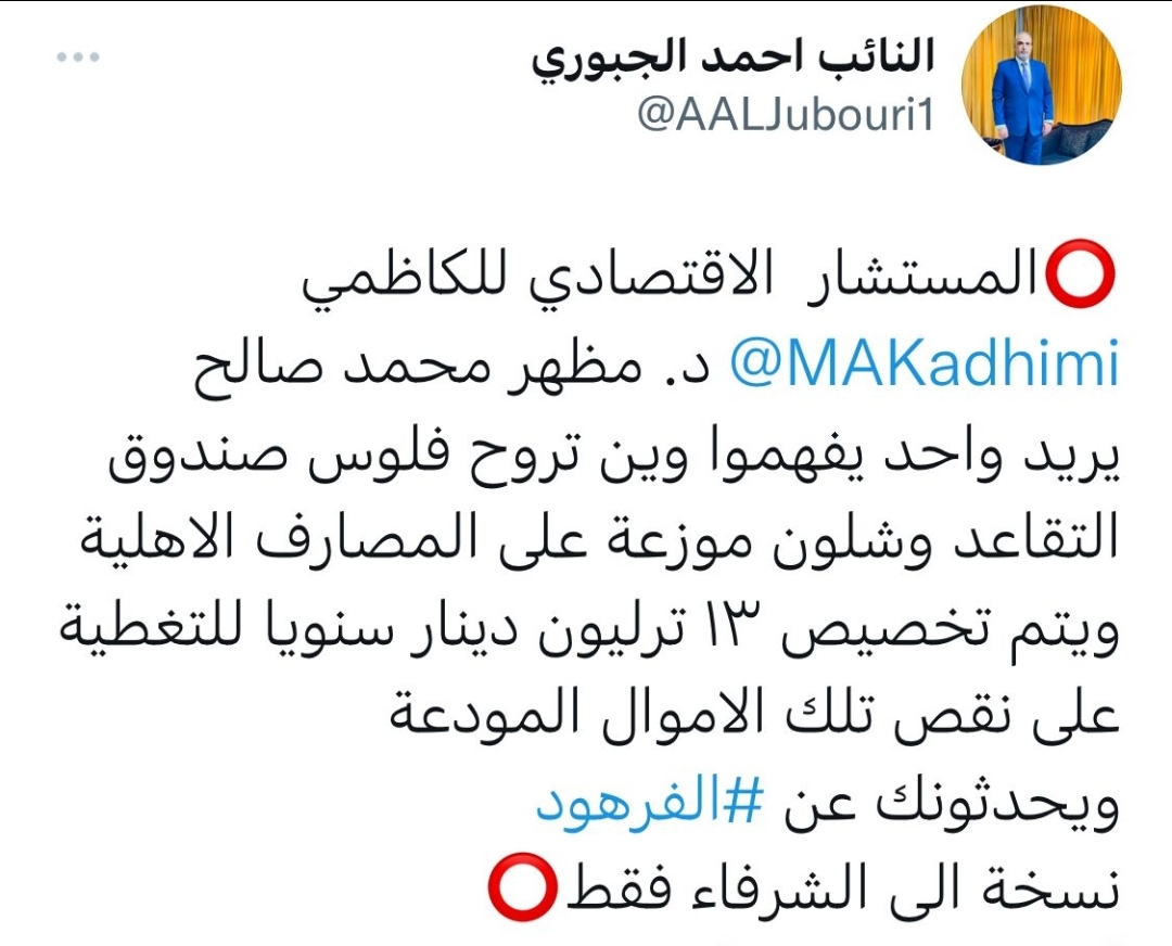 الجبوري مخاطبا المستشار الاقتصادي للكاظمي: اين ذهبت اموال صندوق التقاعد