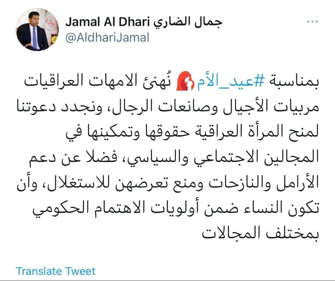 الضاري مغردا: نهنئ الامهات العراقيات مربيات الاجيال وصانعات الرجال بمناسبة “عيد الأم”