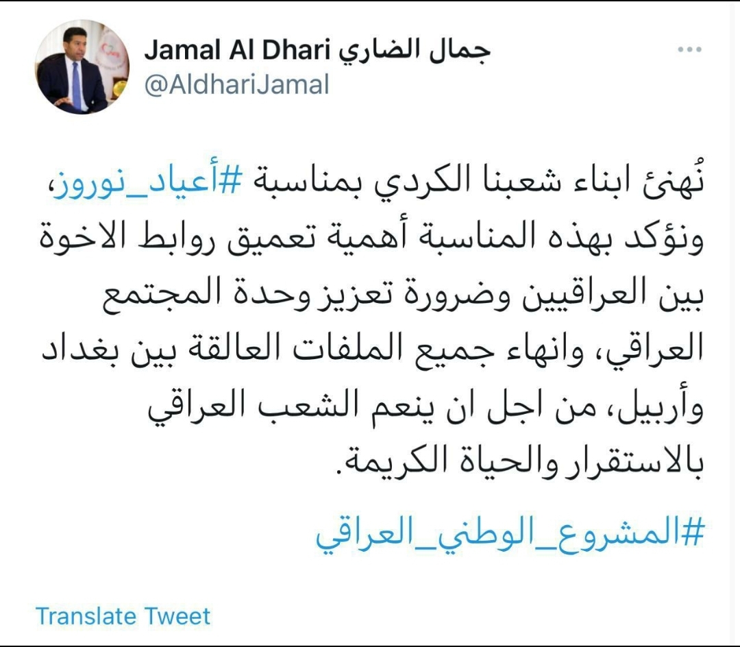 الضاري مغردا: نهنئ شعبنا الكردي باعياد النوروز ونتطلع الى انهاء الملفات التي تعكر صفو العلاقة بين بغداد واربيل