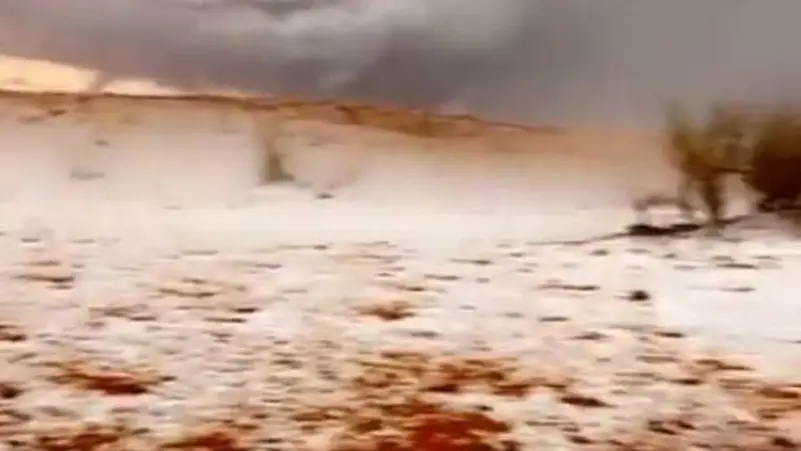 في منظر يخطف القلوب و الأبصار، تلونت إحدى الصحاري في السعودية باللون الأبيض بعد هطول زخات من البرَد بكميات كبيرة.