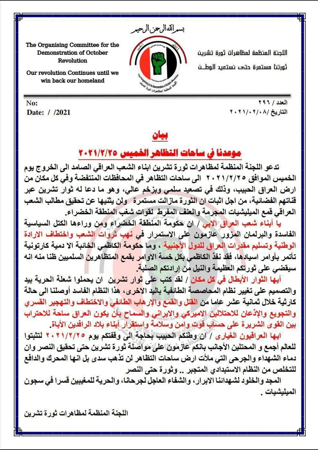 ثوار تشرين يحددون يوم 25 شباط موعدا للتظاهر