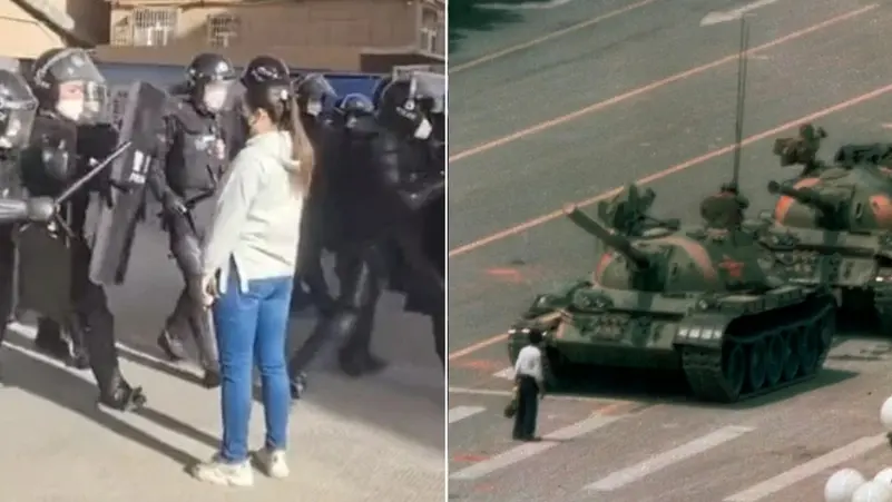 فيما أعادت تلك اللقطات المذهلة إلى الذاكرة قضية “رجل الدبابة” الذي وقف أمام صف من المركبات العسكرية خلال مذبحة ميدان تيانانمن عام 1989، وسرعان ما أصبحت صورته رمزاً للحركة الديمقراطية في الصين.