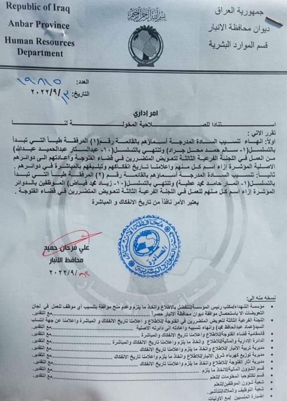 اصدر محافظ الانبار الدكتور علي فرحان امرا اداريا بحل لجنة تعويضات الفلوجة وتشكيل لجنة جديدة وانجاز ملف التعويضات خلال مدة اقصاها 60 يوما .