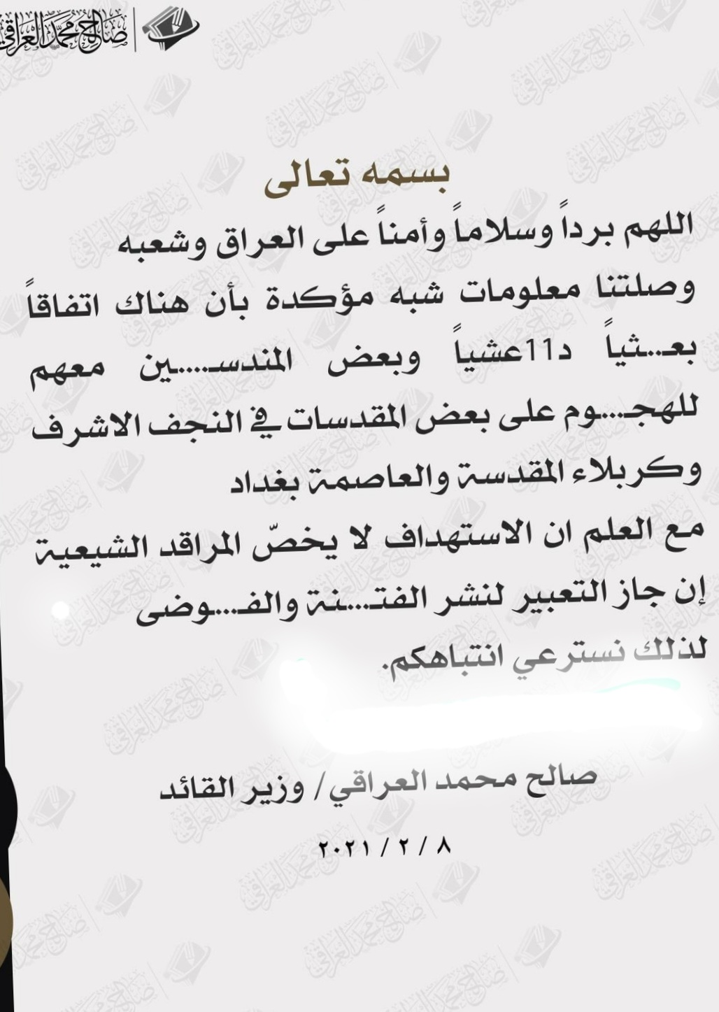 وقال صالح محمد العراقي في بيان له، “وصلتنا معلومات شبه مؤكدة بأن هناك اتفاقاً بعثياً داعشياً وبعض المندسين معهم للهجـوم على بعض المقدسات في النجف الاشرف وكربلاء المقدسة والعاصمة بغداد”.