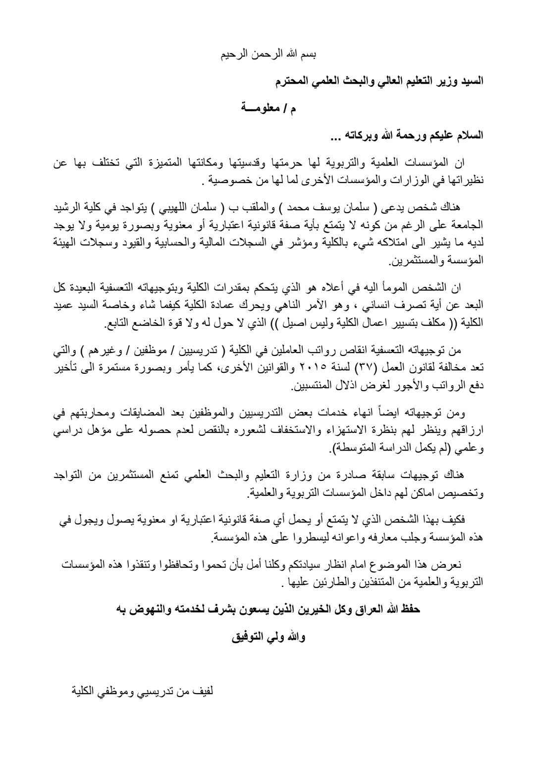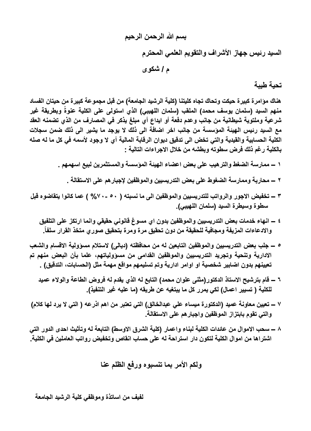مناشدات اكاديمية حول ظواهر الفساد الكبيرة في كلية الرشيد الجامعة