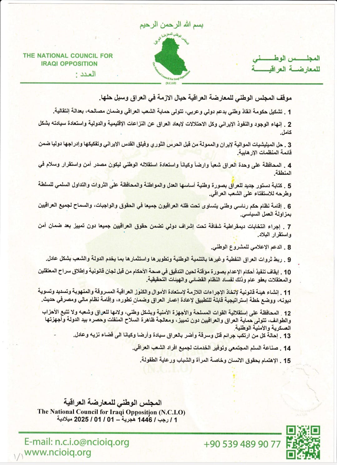 The National Council For Iraqi Opposition. 1/Rajab/1446 AH – 01/01/2025 AD