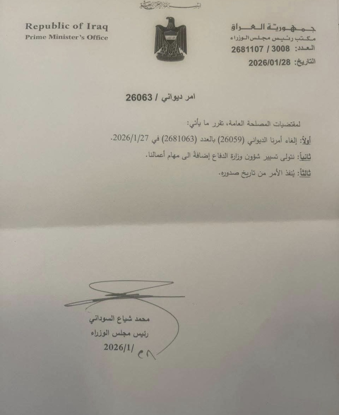 (وثيقة) السوداني يتولى مهام وزير الدفاع